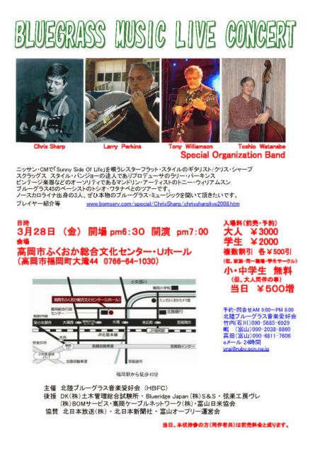 コンサートの 御案内をさせて頂きます。 ブルーグラス・ミュージックのライブです。 クリス・シャープは 昨年に続き2回目の北陸ツアーです。 彼は 日本語も堪能ですので 気軽に声をかけてやって下さい。 他のメンバーは、経験豊富なセッションマン 熟練の演奏をお送りします。 最近は、バンドでの来日ツアーが少なくなったブルーグラスです。 この機会に 本場のブルーグラスを聞きに御出で下さい。 詳しくは此方へ http://www.geocities.jp/suzuki_q_yasuo/hbfc/events/events.html