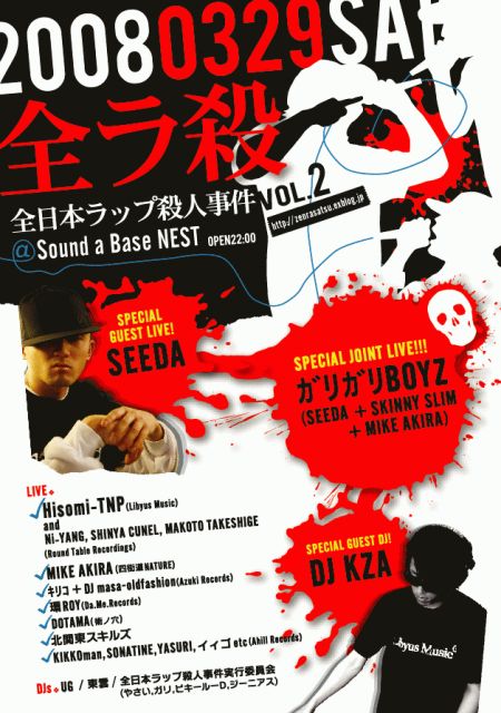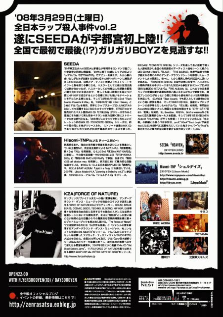 出演させて頂くことになりました。 がんばります!! 栃木にお住まいの方は是非! 栃木にお住まいでない方も是非! 3/29(SAT) 「全日本ラップ殺人事件」 http://zenrasatsu.exblog.jp/ http://mixi.jp/view_community.pl?id=2090343 at Sound a Base Nest(宇都宮) ■OPEN22:00 ■WITH FLYER 3,000YEN(1D) / DAY 3,000YEN Special Guest Live: SEEDA Special Joint Live: ガリガリBOYZ (SEEDA + SKINNY SLIM + MIKE AKIRA) Hisomi-TNP(Libyus Music) and Ni-YANG、SHNYA CUNEL、MAKOTO TAKESHIGE (