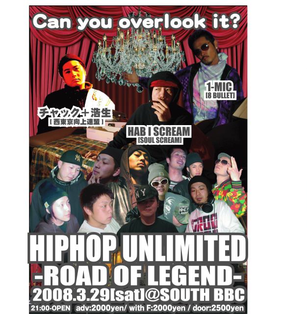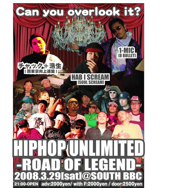 HIPHOP UNLIMITED 〜LORD OF LEGEND〜 2008/3/29[sat] 2000yen/secret -GUEST LIVE- HAB I SCREAM [SOUL SCREAM] 1-MIC [8 BLLET] チャック+浩生 [西東京向上連盟] LIVE Stylee one NAIKA MC ILLBLAST SUIL+ERINA INFINITY SIGE 梳流 2WIN TOWER -DJ- KAZUYA[EXPLOSION] 渉[BLAZE] U-ONE[APPEAL] KOJIMAC[APPEAL] HIRO[INFINITY] IKUMA TO-RU RYO YU-TA YK AYAKA MASA TOMO -FOOD- おやじの喰い処 ”what? HIPHOP UNLIMITED” 2000年からBBC CLUBで行われていた