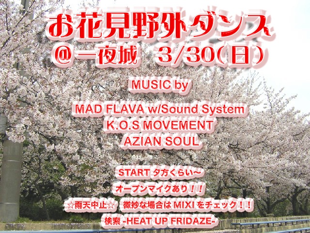 花見ダンスやります!! 2008/03/30 (日) SOUND/ Mad Flava w/SoundSystem KOS Azian Soul and more 夕方スタート夜11時くらいまで!! ☆雨天中止☆ Adm Free レゲエを聞きながら花見しましょう!!! info 09044484294