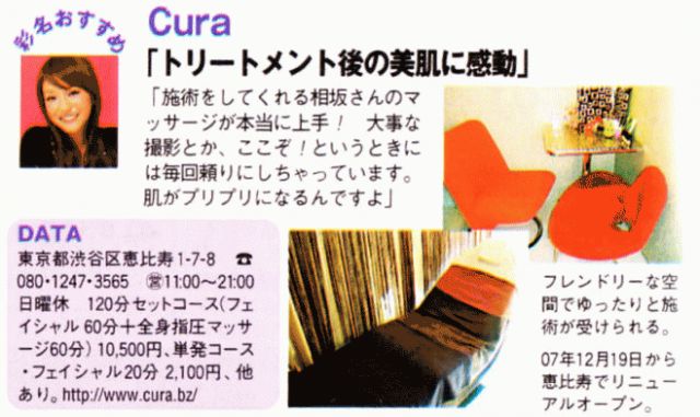 恵比寿駅西口から徒歩2分の、エステサロンです これまで、mixiから230名の方来店ありがとうございます 2月号のReyにもサロン特集で掲載されました 某モデルさんも、お忍びで通っていますよ ・美白したい方 ・くすみがちの方 ・にきびが気になる方 ・肩こりの方 ・若返りたいかた方 ・しみが気になる方 ・小顔になりたい方 ・リラックスしたい方 などなど 大手エステサロンの場合、1回、2〜3万くらいかかる施術内容を 当店では、マンション