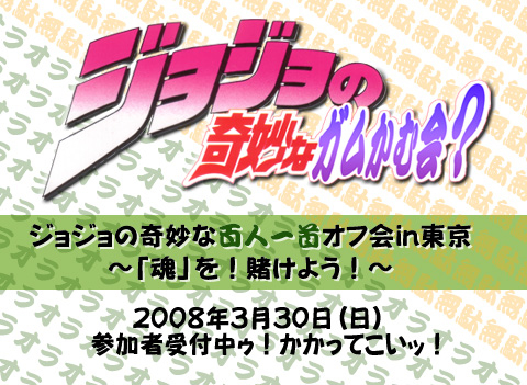 【ジョジョの奇妙な百人一首オフ会in東京〜「魂」を!賭けよう!〜】 このイベントは、ジョジョの奇妙な百人一首をみんなでやろう!というオフ会です。 当日は百人一首だけでなく、3部格ゲー、カラオケ、飲みも企画!企画ゥ! ※なお、今回のオフ会は会場の関係により参加者を18名までとさせていただくッ! 参加希望は先着順ッ! もし希望者が18人を越えるようであれば…ディ・モールト申し訳ないのだが、 キャンセル待ちということで了承していただきたい…。 詳細はこうだッ! ■日時:2008年3月30日(日)