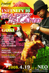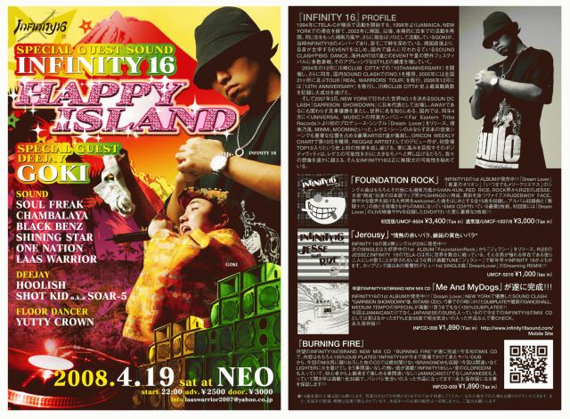 2008.4.19(SAT) 【HAPPY ISLAND】 福島県福島市 @NEO Start 22:00〜 前売り 2500円 当日 3000円 【SPECIAL GUEST SOUND】 『INFINITY 16』 【SPECIAL GUEST DEEJAY】 『GOKI』 [SOUND] SOUL FREAK CHAMBALAYA BLACK BENZ SHINING STAR ONE NATION LAAS WARRIOR [DEEJAY] HOOLISH SHOT KIDa.k.aSOAR-5 [DANCER] ジューシーフルーツ [FLOOR DANCER] YUTTY CROWN SOUND SYSTEM BY BLACK BENZ high power チケット問い合わせ info laaswarrior2007@yahoo.co.jp 前売りチケット取り扱っています!欲しい方居ましたら、メッセージ