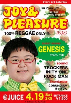 告知失礼いたします。いわき市唯一のALL REGGAEイベントです。 [JOY&PLEASUREvol.2] 2008.4.19.(sat) @BAR JUICE START 22:00 ADM:\1500/1D ■GUEST SOUND■ GENESIS fr.土浦 ■HOST SOUND■ 7ROCKERS INITY ONE ROCKMAN ■FLOOR DANCER■ CORUND*AM きゃさりん いわき唯一のマンスリーレゲエダンス「ジョイプレ」二回目の今回は土浦からSUPER DUPER JUGGLIN'SOUND、GENESISをゲストに迎え更にパワーアップ! 先着15名のお客様にはONE BIG FAMILYよりセレクトCDプレゼント! ONE BIG FAMILY MOBILE HP http://www.freepe.com/i.cgi?iob