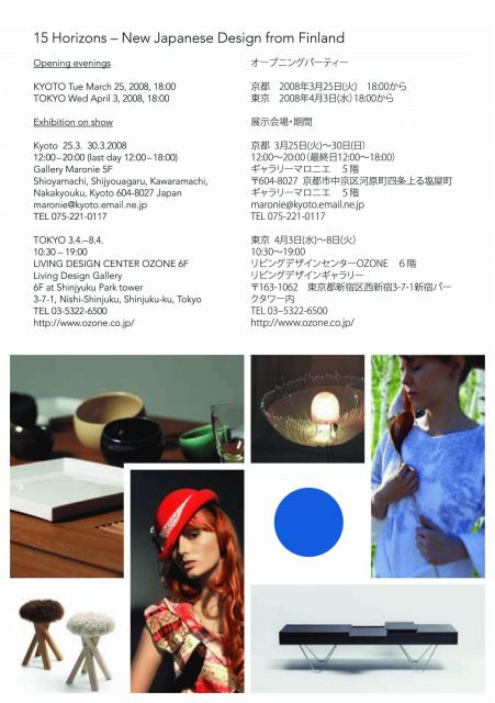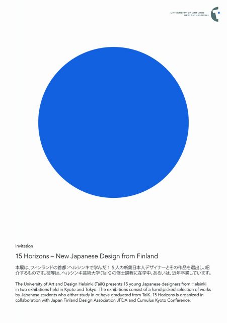「15 Horizons – New Japanese design from Finland 」は、ヘルシンキで学んだ15人の新鋭日本人デザイナーとその作品を選出し紹介するもので、京都と東京で開催されます。彼等はヘルシンキ芸術大学(TaiK)の修士課程に在学中、または近年卒業しています。