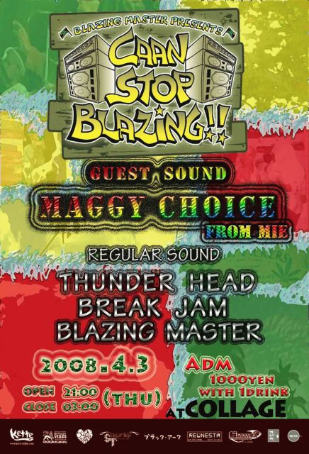 第一木曜日コラージュでのレギュラーダンス“CAAN STOP BLAZING!!”今回は、遠路はるばるORIGINAL NINJA TOWN三重からMAGGY CHOICEがゲストとしてやってきます!初めてみる方も是非チェックしてくださいね!間違いないプレイでコラージュを沸かしてくれるでしょう!早い時間からファンデーションをお酒片手に楽しむもよし、いち早くやばいブランニューをチェックするもよし、思い思いに平日のダンスホールを楽しんでいってください!