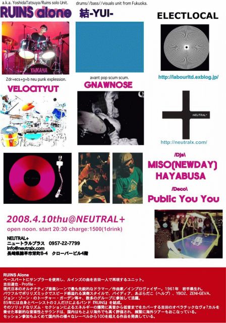 2008.4.10 thu @NEUTRAL+ 長崎県諫早市 http://neutralx.com/ start 20:30 charge/1500(1drink付) ※(遠方来場者へディスカウント有) -Live- RUINS Alone (TOKYO) 結-YUI- (Fukuoka) VELOCITYUT GNAWNOSE -djs- MISO(NEWDAY) MIH◎JUN(chamospher/Sasebo) Dr.Rek(DENKI POO:Absurdity.biz) HAYABUSA -deco- PUBLIC YOU YOU ※ACCSESS ●To NEUTRAL+ NEUTRAL+ http://neutralx.com/ 長崎県諫早市栄町8-4 クローバービル4階(徒然茶房4階) 0957-22-7799※月曜定休日 諌早アーケードのはずれパルファン映画館の
