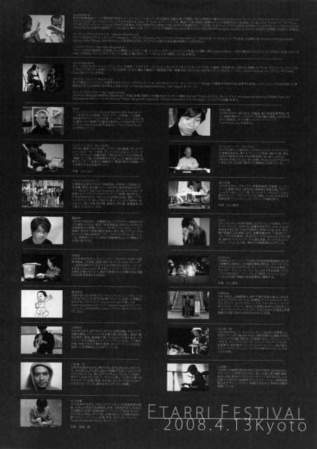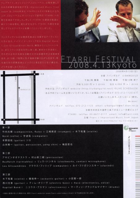 webサイトImprovised Music from Japanの制作/運営するレーベル "Ftarri"の初フェスティバルが東京と京都で開催されます。 情報ページ↓ http://www.ftarri.com/festival/tokyo/index.html http://www.ftarri.com/festival/kyoto/index.html 『Ftarri Festival』 京都(UrBANGUILD) ●4月13日(日) 開演 15:00 - 22:00 終演 全7時間 第一部 竹内光輝 (composition, flute) + 江崎將史 (trumpet) + 木下和重 (violin) Noid (cello) + 宇波拓 (computer) 半野田拓 (guitar) ソロ 山本精一 (guitar, percussion, yang ch