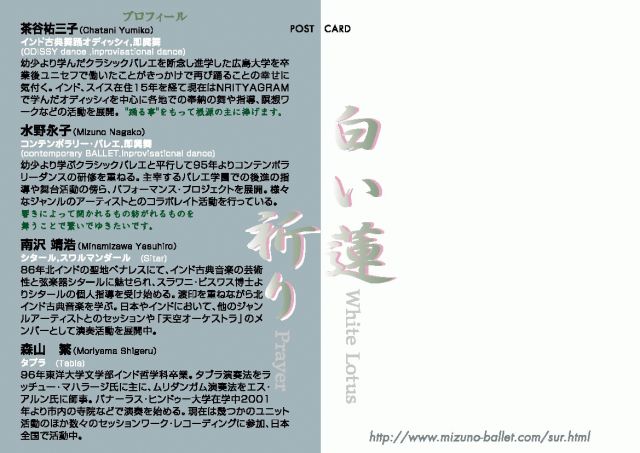 ★『白い蓮・祈り』 ★日時:4月13日(日)15時開演 ★会場: 水野弘子バレエ学園京都スタジオ 京都市下京区七条烏丸北東角ブーケガルニビルB1 スタジオ7 (七条烏丸北東角) ★料金 前売り\3000 当日\3500 学生、シルバー、身障者\2000 (\2500) ★出演:茶谷祐三子,片山永子/舞踊, 南澤靖浩/シタール,森山繁/タブラ ★定員40名 ★予約、お問い合わせ:0774-55-3439片山 当日連絡先09036729803 第一部 インド古典舞踊オディッシィ 第二部 improvisational performance インドに馴染み深いアーティストと共にバレ