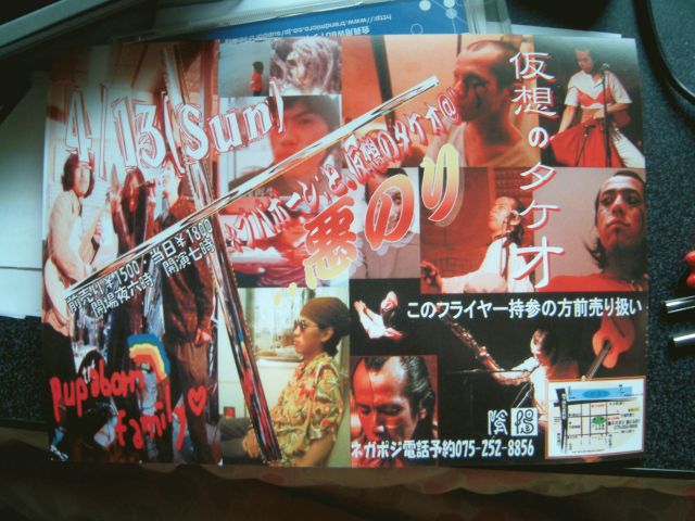 タイトル間違ってるかも お芝居のような変態のようなことしつつ演奏してうたう 仮想のタケオ ってひとに道連れにされますプパボーン☆ファミリー。 我々も大根役者っぷりを見せつけるかもしれませんね! どうなるかは今夜の初顔合わせ次第!だろうか 開場→18:00 開演→19:00 前売り→1500円 当日料金→1800円 (たぶんそれぞれ別途ワンオーダー) フライヤー持参で前売り扱いになるそうだが 手抜きアップロード画像のプリントアウトで効くかは知らないよ ↓ネガポジ↓ http://web.kyoto-inet.or.jp/people/negaposi/