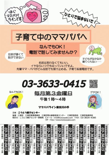 ◆ひとりで悩まないで! ◆子育て応援電話「ママパパライン」 先輩ボランティアが、なんでも話をお聴きする無料の電話です。 子どものこと、自分自身のこと、夫(妻)や義父母のこと、 何でも話せる電話です。 名前は言わなくても大丈夫。 イライラしてつい子どもや家族に当たってしまう方、 話してみたら気持ちがスッキリするかも。 平成20年4月18日(金)午後1時〜4時 (毎月・第3金曜日) 03−3633−0415へ電話(実施日のみ) 対象:子育て中の方 主催:こうとう親子センター http://www.kotooyako.com/ 後援:江東