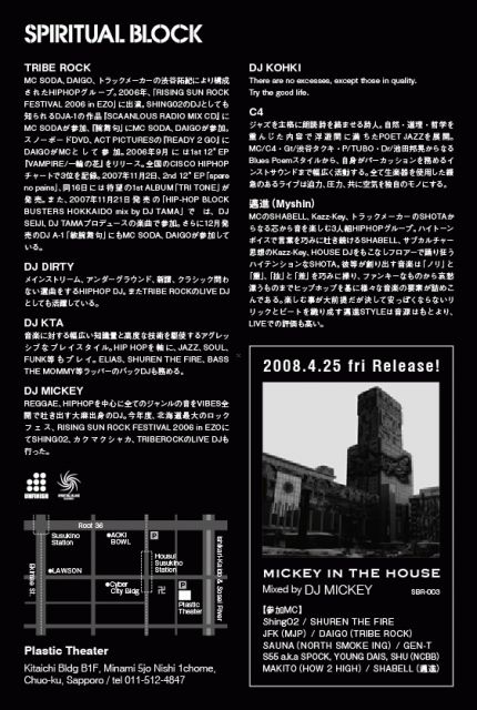 4.18(FRI) at : PLASTIC THEATER (札幌市中央区南5西1) 『SPIRITUAL BLOCK』 OPEN : 22:00 前売り1000円(0DRINK) with フライヤー1500円(0DRINK) 当日2000円(0DRINK) −LIVE− TRIBE ROCK 邁進 KENNY −DJ− KTA MICKEY DIRTY KOHKI(GROW UP) YEN -POET JAZZ LIVE- C4 Blues Poem In The Bosom ※タイムテーブル 22:00〜 DJ YEN 23:00〜 DJ KTA 0:00〜 DJ DIRTY 1:00〜 LIVE? C4 Blues Poem In The Bosom 1:10〜 LIVE? KENNY 1:20〜 LIVE? 邁進 1:30〜 LIVE? TRI
