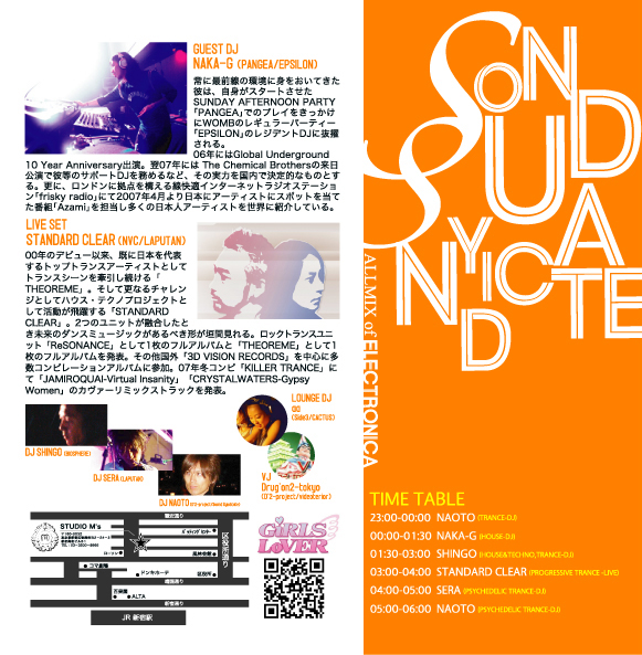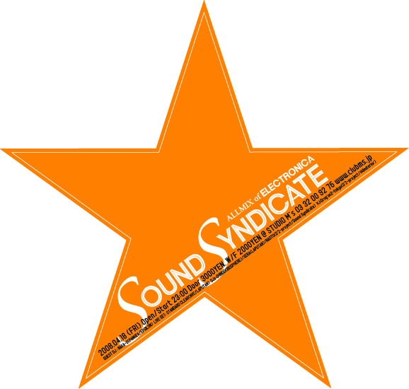 2008.4.18 (Fri-Night) OPEN/START:23:00〜 at Studio M’s SOUND SYNDICATE −ALLMIX of ELECTRONICA− ENTRANCE FEE: \2000(With Flyer) \3000(DOOR) Guest Dj: NAKA-G(PANGEA,EPSILON) Live PA: STANDARD CLEAR(3D Vision,NVC) Dj set: SHINGO (BIOSPHERE) NAOTO (D2-TOKYO,SOUND SYNDICATE) SERA(LAPUTAN) you&aa(CUBIC LOOP/SIDE3/CACTAS) VJ:D2-TOKYO <案内/INFORMATION> Studio M’s  03-3200-9976 CUBIC LOOP情報 (http://c.mixi.jp/cubicloop)