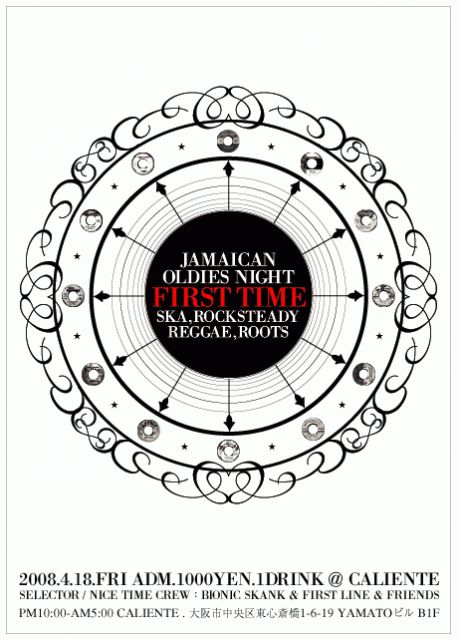 告知失礼します。 KING'S TONE LOUNGEにて毎月第二金曜日に開催中のNICE TIMEより、 NICE TIME CREWがCALIENTEで初めての出演。 今回は70's Reggae Roots & 80's Dancehall Classics。 ■FIRST TIME -Selectors Night- ■2008年4月18日(金)at.CALIENTE ■GUEST SELECTOR : SHOOTER(Drum & Bass)and Secret Guest!!!!! ■SELECTOR : NICE TIME CREW(Bionic Skank & First Line) ■START 23:00 / ADM.1000yen(w1drink) ■CALIENTE : 大阪市中央区東心斎橋1-6-19 YAMATOビル B1F http://homepage.mac.com/m_o_t