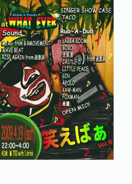 4/19(土) 〜MEET THE BASS〜 13:00〜やれるだけ ADM FREE 場所:大阪・堺 浜寺公園第4駐車場横公園 行き方:臨海29号線 大阪方面→浜寺大橋渡って2つ目の信号左折 和歌山方面→高石大橋渡って2つ目の信号右折 SOUND: ☆ROYAL★STAR☆ from NARA ☆DADA from North Flower Farm ☆REAL WEED from Senboku ☆REBEL WORKS with SOUNDSYSTEM from Sakai Deejay: GUN MAXIM and MORE soundsystem: <神鳴>KAMINARI MAD-POWER ラバダブ オープンマイクあり BBQブースあり 飲食持ち込み自由 70"〜90"dancehall&SKA&ROOTS 大阪・堺 持ち込み自由