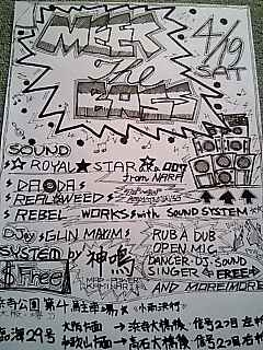 4/19(土) 〜MEET THE BASS〜 13:00〜やれるだけ ADM FREE 場所:大阪・堺 浜寺公園第4駐車場横公園 行き方:臨海29号線 大阪方面→浜寺大橋渡って2つ目の信号左折 和歌山方面→高石大橋渡って2つ目の信号右折 SOUND: ☆ROYAL★STAR☆ from NARA ☆DADA from North Flower Farm ☆REAL WEED from Senboku ☆REBEL WORKS with SOUNDSYSTEM from Sakai Deejay: GUN MAXIM and MORE soundsystem: <神鳴>KAMINARI MAD-POWER ラバダブ オープンマイクあり BBQブースあり 飲食持ち込み自由 70"〜90"dancehall&SKA&ROOTS 大阪・堺 持ち込み自由