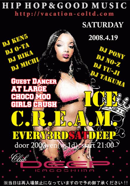 ハイ!!!4月のICE C.R.E.A.M.は2008/4/19(SAT)です!!!しーかーもー、今回はSPECIAL GUEST DANCERにあの伝説のUNIT“ATLARGE”、そしてGUEST DANCERに“CHOCO MOO”と“GIRLS CRUSH”を迎えます!!!間違いない!!!“ATLARGE”のSHOWはこの日限りです!!!皆さん是非遊びに来てくださーイ!!!