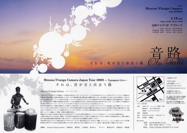 今回の来日にあたり西アフリカ ギニア共和国に縁がある 日本を代表する選りすぐりのドラマー ダンサーたちが彼の元に集結 ジェンベ ドゥンドゥン 歌 ダンスの共演 遠くギニアの生きた音楽をお届けします 東北では今宵限りのコンサート ぜひ御一緒に音の路へご同乗ください!! DounDoun Monster JAPAN TOUR 2008 『ンタンガ 来た!!!ンガ〜〜〜〜〜〜〜〜〜〜!!!』 ついにこの春、 すごい男がやってくる!!! 遠く離れたギニア共和国から、 前代未聞のドゥンドゥンフォラの初来日。 これは見逃せない!!! http:/