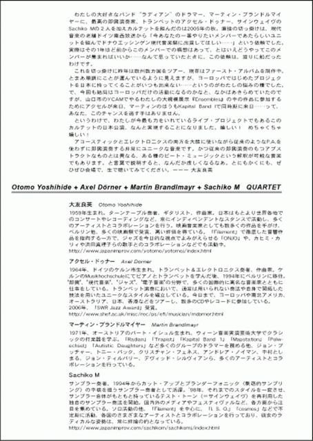 4/22 (TUE) ことにパトス 西区琴似1-4 (地下鉄琴似駅B2F Tel.011-612-8383) 開場19:00 開演19:30 前売券¥4,000 当日¥4,500 4プラ、大丸、ヤマハ各プレイガイド他、ことにパトス、くう、ウィアードメドルレコード、OTOGAKU、キコキコ商店、etc- 企画協力/キャロサンプ 主催・問い合わせ・予約/NMA Tel&Fax. 011-742-3458 nma-1983@mbr.nifty.com http://homepage2.nifty.com/nma アコースティックとエレクトロ二クスの両方を大胆に使いながら従来のようなP.A.を使わずに即興演奏する非常にユニークな音楽です。かつ従来の即興演