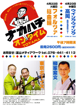 東京ボーイズの兄さん達と紫文による会です。 ボーイズのナカハチ兄さんは富山の出身です。 富山公演 日 時 : 4月22日7時〜 出 演 : 東京ボーイズ・柳家紫文 場 所 : フォルツァ総曲輪 料 金 : 2500円(当日3000円) 高岡公演 日 時 : 4月23日7時〜 出 演 : 東京ボーイズ・柳家紫文 場 所 : ウィングウィング高岡 料 金 : 2500円(当日3000円) 問い合わせ : 富山メディアワーク 電 話 : 076−441−4112