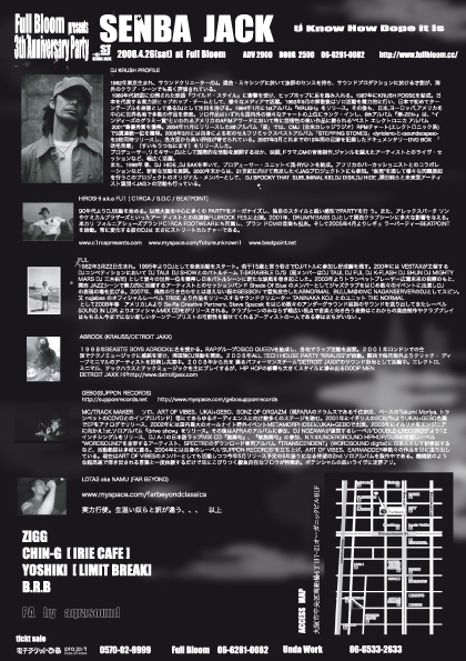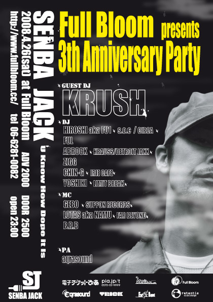 broのみんな、とうとう成功しました、この南船場にあるFULL BLOOMにDJ KRUSHさんがゲストとして来てくださいます! 日時4月26日11時オープン。今回のメンバーは、FU-1、FUL、ABROCK、ZIGG,CHAN-G、YOSHIKI、GEBO、LOTAS、B,R,Bです。お店の三周年で記念パーティ、兼、もっと色々な方々に知ってもらうため。。。