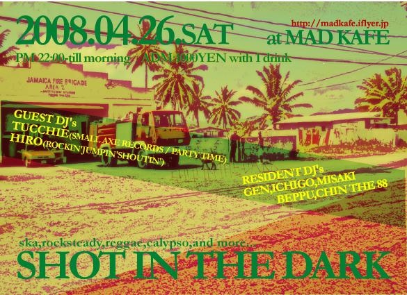 お久しぶりです。2008年になって初の開催!!!流浪のイベント“SHOT IN THE DARK”の今回は、場所をアメリカ村にある“MAD KAFE”に移しての開催になります。皆