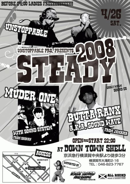 Down Town Shellではお馴染みSTEADY。2月はお休みしましたが4月はガッチリLine Upが決まりました。まずは湘南からMuder One!!そして初登場のButta Ranx From Sound Wave!!Buttaは静岡在住のJamaican、JamaicaのSound WaveのSelectorです!!まだ見た事ない人が多いと思いますがこの日は横須賀の夜がKingstonの夜に変わります。それと