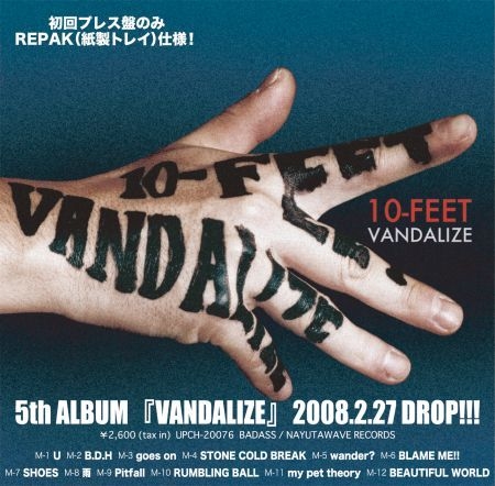 10-FEET "VANDALIZE" TOUR 2008 5月15日(木) 宮崎SR-BOX OPEN 18:00 / START 18:30 TICKET 前売り¥2,800 / 当日券¥3,300 ■10-FEET ■Fat Prop ■BIG FOOT GEORGE TICKET 一般発売日 3月1日(土) チケットぴあ(Pコード:282-869) ローソンチケット(Lコード:81791)