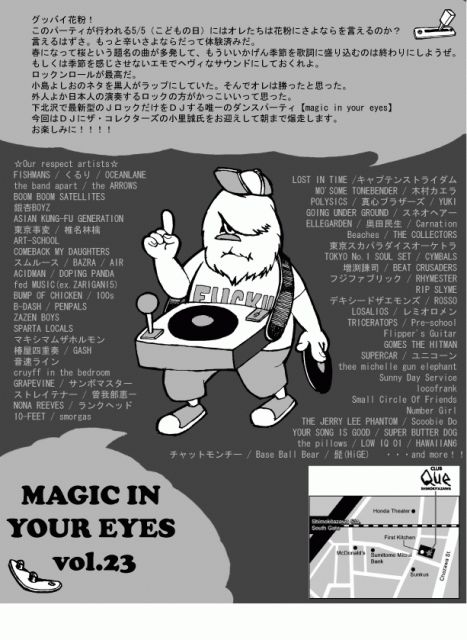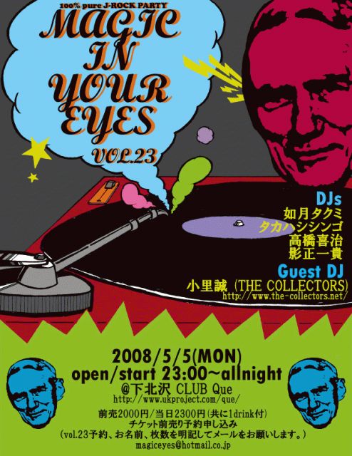 GW後半のこどもの日・下北沢CLUB Queにて邦楽オンリーパーティー『マジック・イン・ユア・アイズ』を子供の日に開催します。今回はゲストDJに小里 誠さん(THE COLLECTORS)をお迎えして、朝までノンストップ大爆走! オネイサンもオニイサンも、是非遊びに来てください! DJ&スタッフ一同、下北沢でお待ちしています!