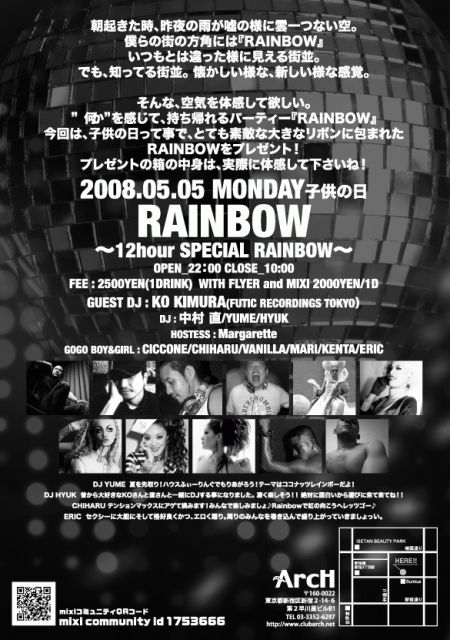 Arch は、その昔 Delight っていう、新宿二丁目にある本格クラブとして、ゲイ・コミニュティの外、ストレートのクラブシーンでも大きく注目を集め、現在活躍する多くのゲイDJを育てデビューさせた、エポック・メーキングなハコでしたが、そのハコのオープンからクローズ迄、自分がレジデントで月一回、土曜日にやっていた、ゲイ・ミックス・パーティのタイトルも“RAINBOW”でした。“ゲイ・ミックス”なんていうパーティのカテゴライズも、この