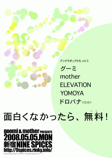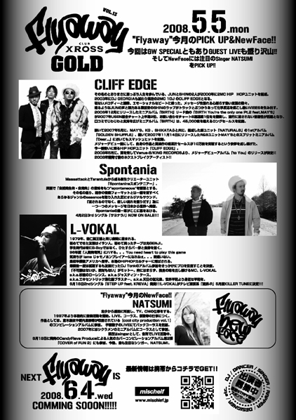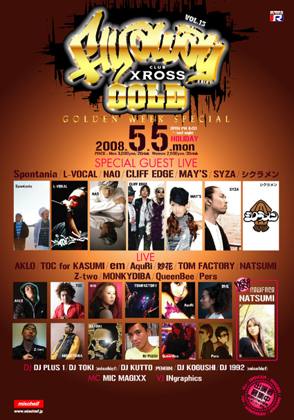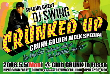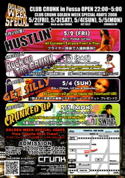 最新のHIPHOP.R&Bを中心にCRUNKレギュラーDJ YUMA&LilJunがフロアを熱く盛上げます!!当日は入り口にて身分証明書を掲示して頂ければ誕生日月の方入場無料!!(男女ok)さらに5月4日、5日のみ使えるディスカウントチケットを100名様にプレゼント!!!誕生日の方にはシャンパンのサービス