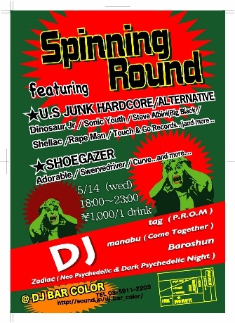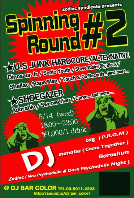管理人様告知失礼致します! ネオサイケダークサイケでトランス系サイケを告知するようなコミュニティ違いイベントですが、失礼します(笑) Spinning Round featuring: ☆U.S JUNK HARDCORE/ALTERNATIVE Dinosaur Jr / Sonic Youth / Steve Albini(Big Black / Shellac /Rape Man / Touch & Go Records...and more... ★SHOEGAZER Adorable / Swervedriver / Curve...and more.... 5/14 (Wed) @ DJ BAR COLOR 03-5911-2203 18:00〜23:00 1000yen 1drink付 DJ:::: tag ( P.R.O.M ) manabu( Come Together ) Baroshun Zodiac( Neo Psychedelic