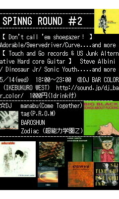 18か月ぶりSpinning roundを開催します! ※奇数月の第二水曜日、すなわち平日のイブニングイベント...更に池袋とゆう、あまり良いとは言えない条件下で(笑)だからこそ、ニッチな特集を、盛り込み、その特集アーティストやジャンルに深い愛情と音源を(笑)お持ちのゲストDJさんを毎回招聘し、開催していきます。 -------------------------------------- 【Spinning round】#2 【 Don't call em' shoegazer! 】 Adorable/Swervedriver/Curve....and more 【 Touch and Go records & US Junk Alternative Hard core Guitar 】 Steve Albini / Dinosa