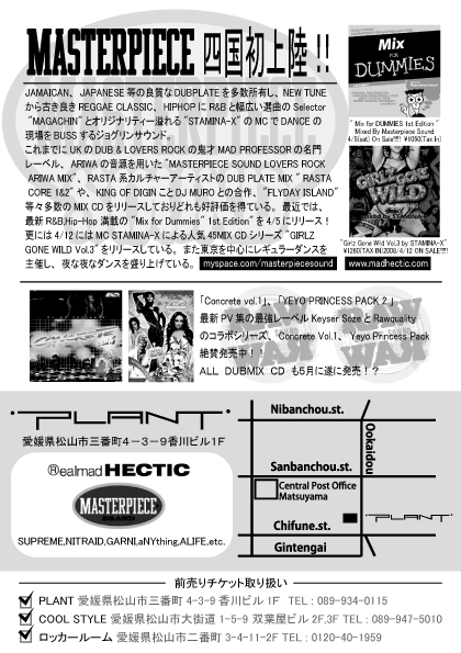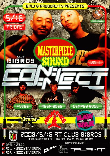 告知失礼致します。 愛媛・松山の定番イベント「BUS RIDE」で活躍中の「BUSRIDE MOVEMENT JAPAN」(B.M.J)と東京と松山のレゲエシーンでお馴染みのサウンド「RAWQUALITY」が、愛媛と関東のダンスホールシーンを繋ぐべく、ニューイベント「CONNECT!!」をスタート。 記念すべき第一回目のゲストは、四国初上陸! 東京のビッグバッドサウンド「MASTER PIECE SOUND」が登場!! 「MASTER PIECE」と「RAWQUALITY」は、東京で一番ホットなビッグイベント「Girlz Gone wild」のホストサウンドとして共演しているだけに、阿吽の呼吸のジョグリンは見逃せ