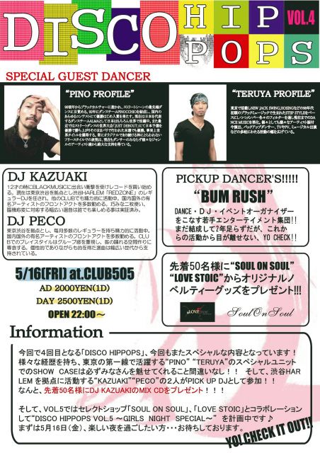 5月16日(金)に九州 宮崎にて、“PINO(ALMA)+TERUYA(SLUGGER)”のスペシャルユニット出演イベントを開催します!! DISCO HIPPOPS VOL,4 5月16日(金) 場所505 <GUEST DANCER>PINO(ALMA) +TERUYA(SLUGGER) <PICKUP DJ>KAZUAKI,PECO, <DJ>KAZUYA,KOHEI,SHINPEI, <DEE JAY> WARLY <DANCER> BUMRUSH,Dazzy more,カッパ隊,JUMBLE UP,BUDDY BASE, and more... <時間>22:00〜5:00 <料金>前売り2000円(1DRINK) 当日2500円(1DRINK)
