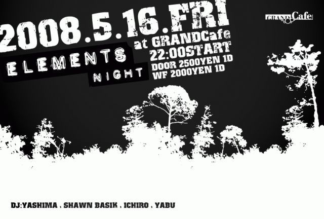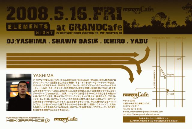 関西ハウスシーンのブライテストホープとして、圧倒的な人気を誇る、DJ YASHIMA がMAIN ACTを務めるNEW PARTY [ elements NIGHT ]が、西日本のハウスミュージックの聖地 GRAND Cafeにて満を持して遂に始動!!