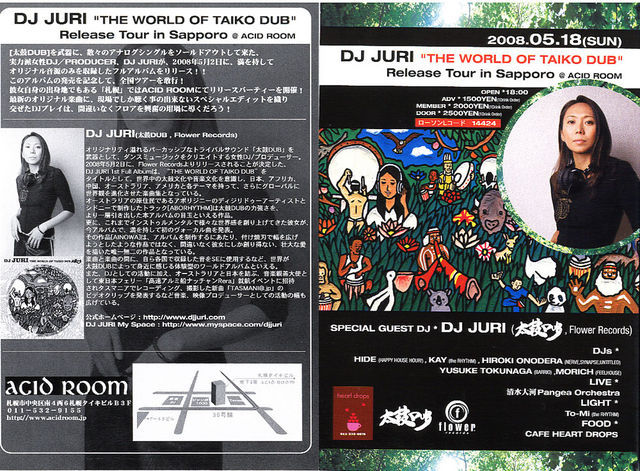 わーい(嬉しい顔)5月18日(日)  ぴかぴか(新しい)DJ JURI太鼓dub 「THE WORLD OF TAIKO DUB」リリースツアーぴかぴか(新しい) 場所; ACIDROOM(札幌市中央区南4条西6丁目タイキビルB3F ) SPECIALGUEST> DJ JURI(太鼓DUB、FlowerRecords) DJ> HIDE(HappyHouseHour!) KAY(TheRHYTHM) HIROKI ONODERA(NERVE-SYNAPSE) YUSUKE TOKUNAGA(BARRIO) MORICH(FEELHOUSE) LIVE> 清水大河 Pangea Orchestra 『清水大河 Pangea Orchestra』 <メンバー> 清水大河(ジェンベ、シンギングボール)from DjahVaDuBa つくね(大太鼓・月鼓、チ