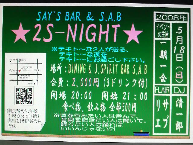 イベントしますイベント マイミクでもある『SAY'S BAR』の清一郎さんとコラボでウッシッシ手(パー) SAY'S BAR & S.A.B 夜2S-NIGHT夜 ※テキト〜な2人が送る、  テキト〜な夜を  テキト〜にお過ごし下さい。 えんぴつ2008.5.18(日) DINING & J.SPIRIT BAR S.A.B 有料2000円(3ドリンク付) OPEN 20:00 START 21:00 レストランビールFOOD&DRINK ALL 500円 台風酒を呑みたい人は呑んで、  音楽を聴きたい人は聴いて、 踊りたい人は踊ればいいんじゃないexclamation & question CDDJ:清一郎 バーFLAIR:サ