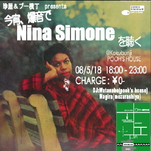 国分寺のレコード屋 珍屋と 国分寺のジャズ喫茶 プー横丁の店 の二店共同で、 毎月、主にジャズを中心にテーマを決めて、 そのテーマに沿った音楽を聴く鑑賞会を行っております。 (http://blog.livedoor.jp/mezurashiya/archives/51021679.html) 5月はニーナシモンを特集いたします。 ニーナシモン作品を大きめの音量で鑑賞していただけます。 ノーチャージ、飲食代のみですので、 ご興味のある方、是非、いらして下さい。 お待ちしております。  珍屋コミュ   http://mixi.jp/view_community.pl?id=150043