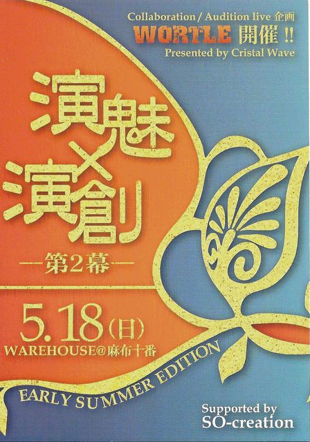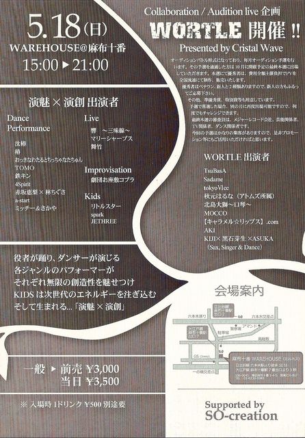 麻布十番、WAREHOUSEにてオールジャンルイベント開催! プロダンサーに新進シンガー、演劇人から楽器奏者にキッズまで、 多数の実力者が熱いパフォーマンスを繰り広げます! 費用全額主催負担で全国流通にてPVを制作、販売するチャンスが掴めるオーディションも有り! 楽しみたい方も、次回から参加希望の方も是非お越し下さい! チケットはコメントかメッセにて前売り価格でお受けします。 2008年5月18日(日) 「演魅×演創」 役者が踊り、ダンサーが演じる 各ジャンルのパフォーマーがそれぞれ無限の創造性を魅せつけ