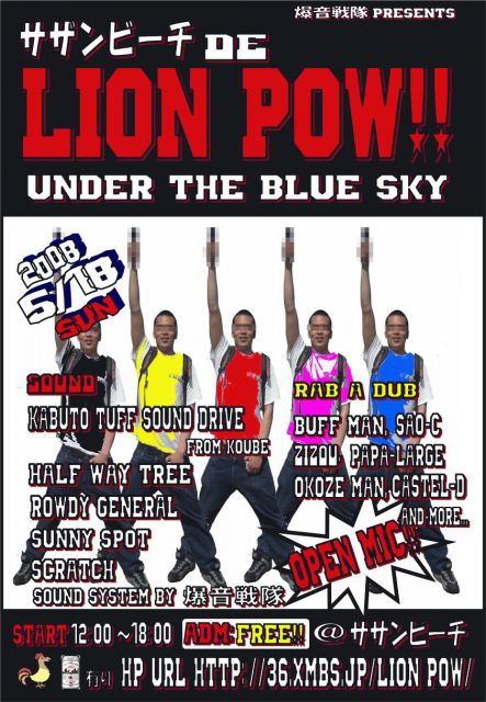 2008.05.18(日曜日) 12:00〜18:00 @大阪府泉南サザンビーチ <ADM FREE!!> [SOUND] KABUTO(甲)TUFF SOUND DRIVE from KOBE HALF WAY TREE ROWDY GENERAL SUNNY SPOT SCRATCH [RAB A DUB] BUFF MAN、Z蔵、竿師、PAPA-LARGE、OKOZE MAN、CASTEL-D(RAB A DUB OPEN MIC) [SOUND SYSTEM] 爆音戦隊 ジャークチキン&BARあり。 雨天の場合は岸和田市のGLOBで開催します。 詳しくはBAKUONSENTAI@softbank.ne.jp(river)まで 爆音戦隊Presents 大阪泉州「LION POW」野外ダンスコミュニティ http://mixi.jp