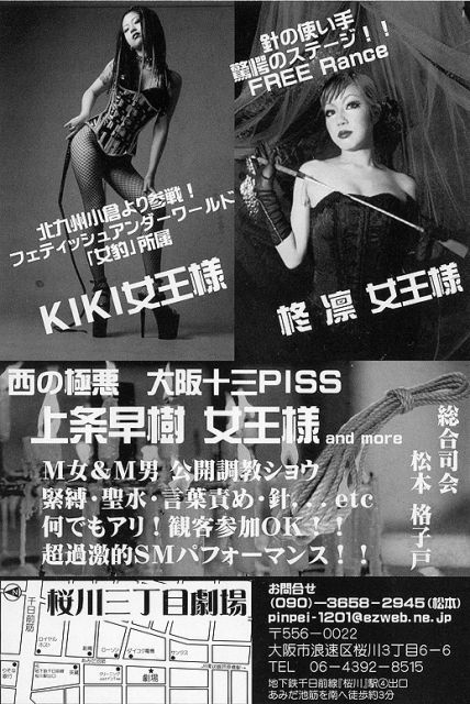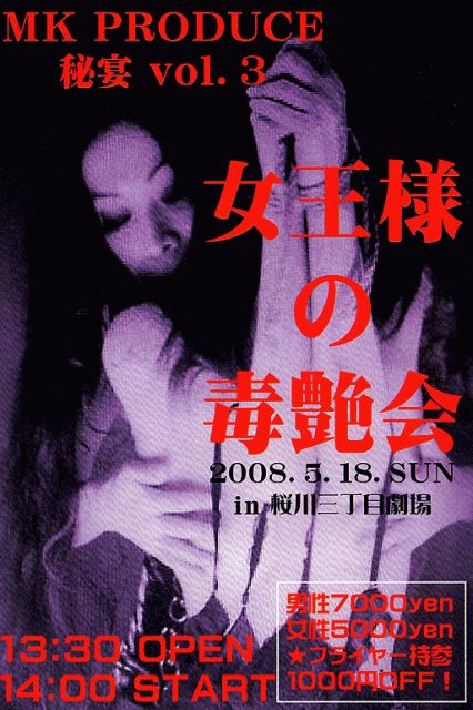 MK PRODUCE 秘宴vol.3 『女王様の毒艶会』 2008年5月18日(日)in桜川三丁目劇場 13:30 Open 14:00 Start 男7000yen 女5000yen フライヤーあり1000yenOFF info: 090-3658-2945 pinpei-1201@ezweb.ne.jp ●SMパフォーマンス ●公開調教 ●観客参加 ≪出演者≫ 上条 早樹 柊 凛 KIKI ≪総合司会≫ 松本 格子戸 @桜川三丁目劇場 大阪市浪速区桜川3丁目6−6 TEL-06-4392-8515