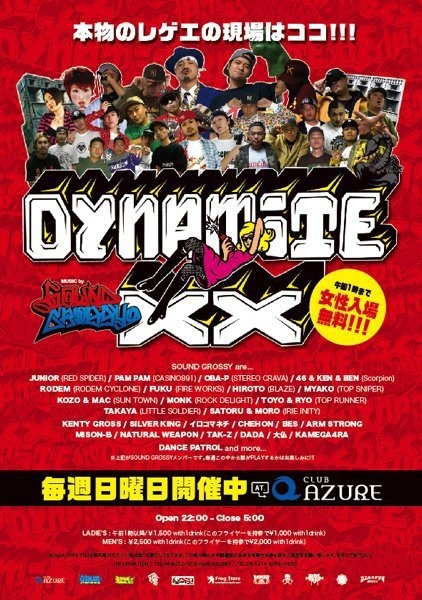 DYNAMITE XX 毎週日曜日開催中!!! 大阪市 中央区 @club AZURE (西心斎橋2-17-3アーク心斎橋WEST B1F TEL:06-6212-0226) OPEN 22:00 【SOUND GROSSY】 JUNIOR (RED SPIDER)/PAM PAM (CASINO891) OBA-P (STEREO CRAVA)/46&KEN&BEN(Scorpion) RODEM (RODEM CYCLONE)/FUKU (FIRE WORKS) HIROTO (BLAZE)/MYAKO (TOP SNIPER) SUN TOWN/ROCK DELIGHT/TOP RUNNER KENTY GROSS/イロコマネチ/SILVER KING ARM STRONG/CHEHON/BES/MISON-B NATURAL WEAPON/TAK-Z/DADA/大仏 DANCE PATROL and many more!!! ※毎週この中