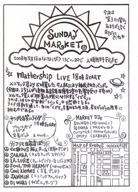 今月は都合により第3日曜日ですexclamation ×2 お間違え無く遊びにきてくださいね♪ 2008年5月18日(日) 13時〜20時 入場無料 るんるんLIVEるんるん18時START 「mathership」 メルマック星より不時着した7人組により結成されたバンド。 (今回は、うち1人が後期高齢者医療制度の影響を受け不参加。)  メルマック星人が興奮した際に分泌する物質「イズモ」 それは、彼らの宇宙船「ライン6」の燃料となる。 ライブ活動を通して、多くの「イズモ」を集めるため、 日夜、昇天のギリギリ限界に挑むのである。