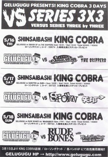 2008.5.18(Sun) at 心斎橋 KING COBRA OPEN/START 17:00/18:00 前売 \2300 / 当日 \2800 LIVE: GELUGUGU RUDE BONES MiniSK@BOX 心斎橋KINGCOBRA http://king-cobra.net/osaka
