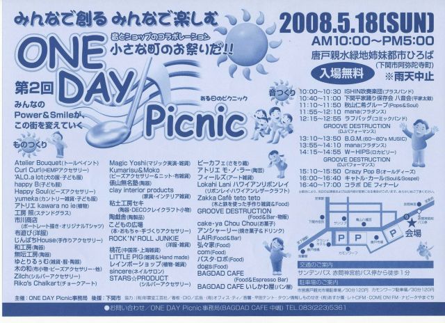 〜音とショップのコラボレーション〜 みんなで創る みんなで楽しむ 小さな街のお祭りだ!! “みんなのPower&Smileがこの街を変えていく” 参加者、全員が主催者のお祭り(イベント)です晴れ 個々のPOWERを持ち寄って、大きなPOWERに変えていく…ムード 今までにないお祭り ワンデイピクニックさくらんぼ 通称ワンピクグッド(上向き矢印) 参加する飲食店の中にBAGDADももちろんありますコーヒー ショップゎ手作りアクセサリーや雑貨、陶芸などなど... ステージでゎバンドやダンスなどなど... ピクニック気分で気軽に来てみてくださ