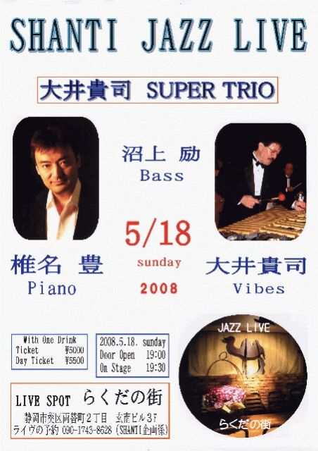 5月のSHANTI JAZZ LIVEのライヴの告知をさせてください     大井貴司スーパートリオ@らくだの街          大井貴司 ヴィブラフォン          椎名豊  ピアノ          沼上励  ベース 両替町らくだの街はクラシカルなインテリアで落ち着いた雰囲気の店です ソファーに座りゆったりと演奏とお酒をお楽しみいただけます 店内改装により ステージ席とカウンター席がつながり広くなりました  また追加ドリンクも500円とリーズナブルです 場所 両替町LIVE SPOT らくだの街 時間 開場19:00 開