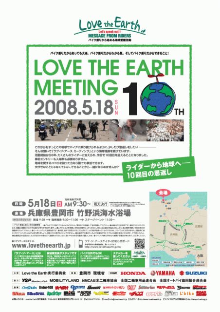 ご存じの方もおられるかと思いますが、バイク乗りからはじめる環境活動である「LOVE THE EARTH(ラブジアース)」というイベントがあります! http://www.lovetheearth.jp/event/080518/index.html HPより 内容は上記ページを見ていただければわかりますが、海岸のゴミ拾いをしよう!というものです。 開催場所がお隣兵庫県の竹野海岸ということで、これは鳥取のバイク乗りとしては行かなければ!! 清掃活動の開始が朝からなので、出来れば前日にキャンプをして乗り込みたいと思います。 おおまかですが、次のよ