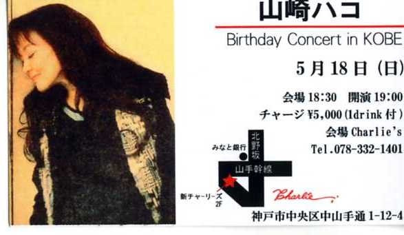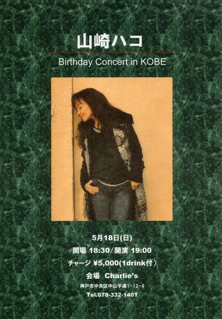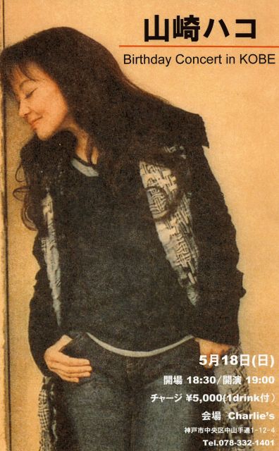 山崎ハコ Birthday Concert IN KOBE チケット販売のお知らせ! 誠に申し訳ありませんが、企画時にほぼ完売状態です。 &会場のキャパシティーの問題もあり 12名の席しかありません。 関西在住者限定&抽選としたいと思います。 5月18日(日)・・ハコさんのお誕生日です! 開場 18:30 開演 19:00 チャージ \5、000(1drink付) 会場 Charlie's sensuisi2005@yahoo.co.jp まで、以下をお書きの上メールして下さい。 なお、チャーリーさんへ電話をされてもチケットは ありません。 くれぐれも