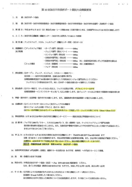 第10回加古川市長杯ボート競技大会が開催されますのでご案内します。 ----------------------------------------------- 期日 5月18日(日) 午前8時〜 場所 いつもの加古川市立漕艇センター 種目 ナックルフォア、スカル、シェルフォア 距離 500m 参加費 7000円/1クルー(振込) *要項にも書いてますが今年から振込みとなっておりますのでご注意ください。 漕艇センターに確認しましたところ振込用紙は漕艇センターにありましてFAX送信は無理との事です